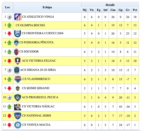 Săptămâna viitoare, 4 octombrie, ora 15: Socodor – Curtici, Șiria – Șimand, Pâncota – Vladimirescu, Bocsig – Pecica II, Felnac – Nădlac, Sebiș – Macea. Athletico Vinga va sta.