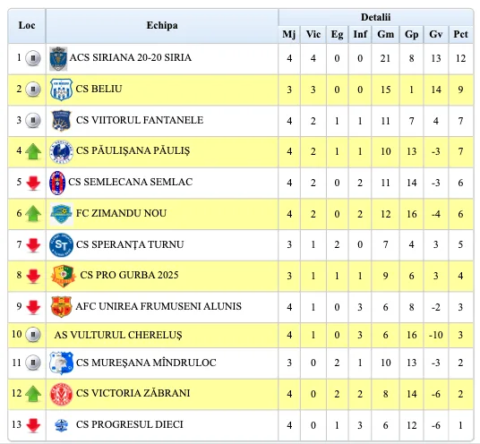 Săptămâna viitoare, 4-5 octombrie, ora 15: Păuliș – Șiria, Semlac – Gurba, Chereluș – Zimandu Nou, Zăbrani – Beliu, Turnu – Mândruloc, Dieci – Fântânele. Unirea Frumușeni Aluniș va sta.